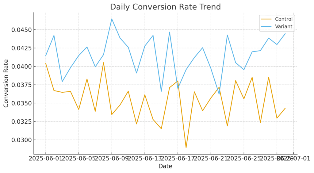 Notice how the Variant line consistently tracks above Control. This pattern suggests the banner’s effect is durable, not a one-day anomaly.