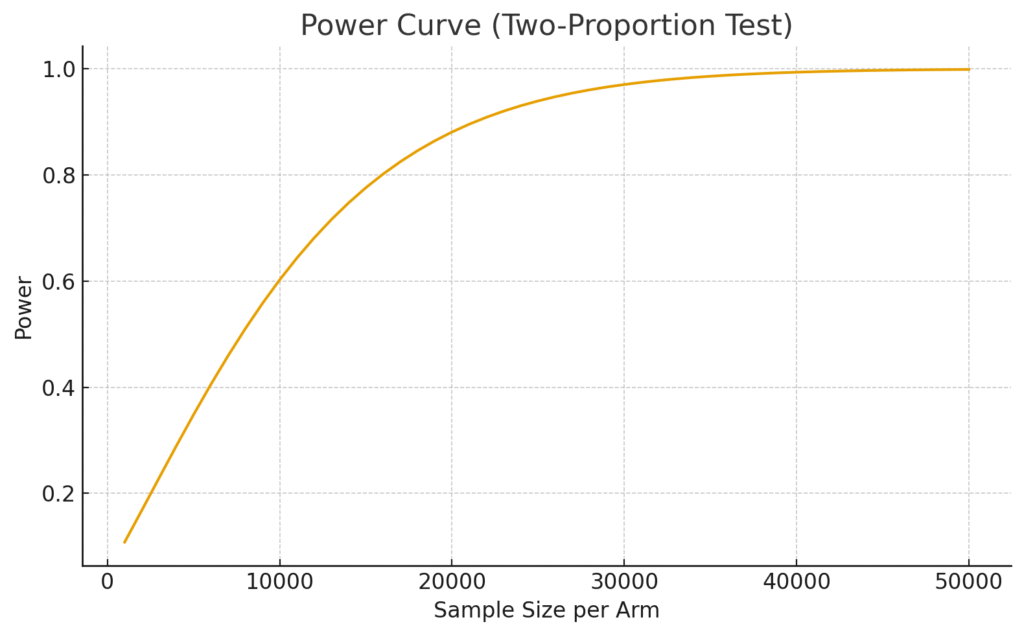 This chart shows how test power increases with sample size. With our uplift (+0.6 pp), ~20,000 users per arm achieve ~80% power.