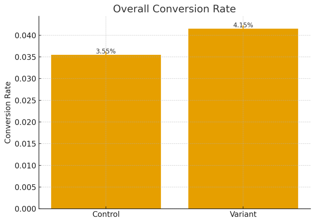 - Variant conversion: 4.1% (+0.6 pp uplift, statistically significant)